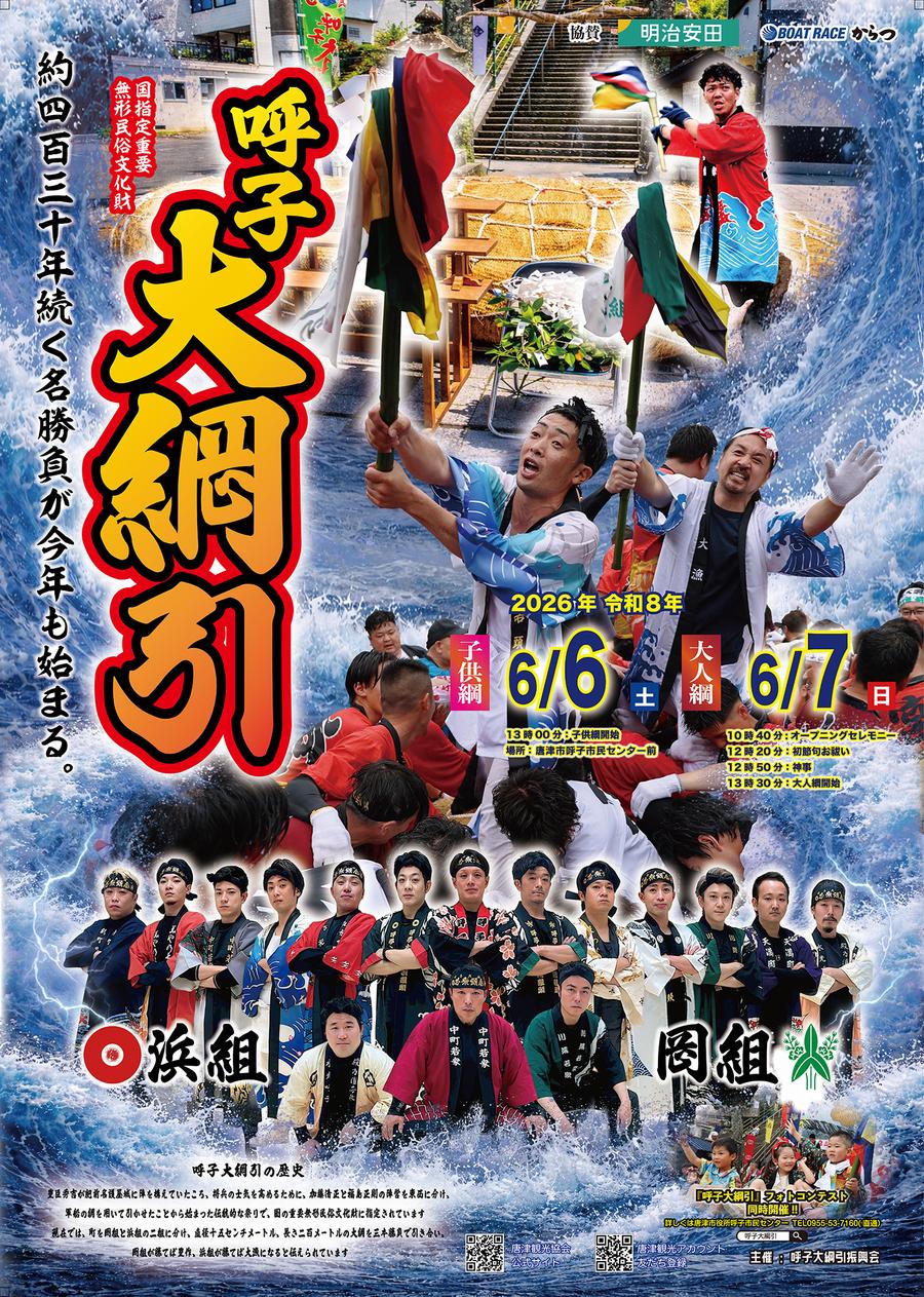 現在では、町を岡組と浜組の2組に分け、直径15センチメートル、長さ200メートルの大綱を3本勝負で引き合い、岡組が勝てば豊作、浜組が勝てば大漁になると伝えられています。